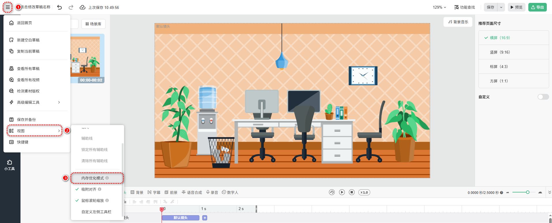 打开编辑界面,点击顶部右侧菜单图标,点击【视图】->【内存优化模式】;